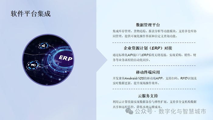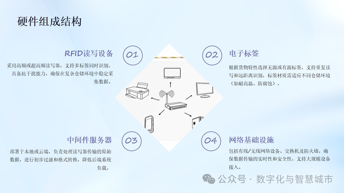 RFID仓储管理系统架构包括RFID读写设备(固定式/手持式)、适应不同环境的RFID电子标签(抗金属、耐温等特种标签)、RFID中间件服务器及数据管理平台,通过RESTful API与ERP/WMS等系统无缝对接。