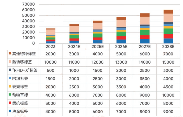 近年来,全球RFID标签市场呈现快速增长态势。以下是各种标签出货量的分析,其中动物耳标每年以1000万个的量进行递增。结合UHF RFID标签的特点,动物管理主要的适用场景是,RFID动物电子标签等非体内注射标签,以及有大规模资产管理需求的场景。