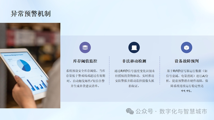 - 异常预警机制(库存阈值告警、非法移动检测、设备故障预判)。