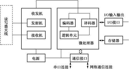 RFID读写器是一个捕捉和处理RFID标签数据的读写设备,它可以是单独的个体,也可以嵌入到其他系统之中。读写器的硬件部分通常由收发机、微处理器、存储器、外部传感器/执行器,报警器的输入/输出接口、通信接口及电源等部件组成。